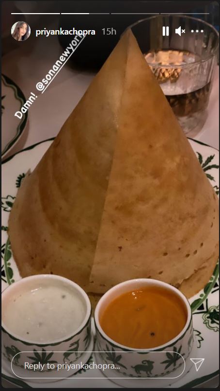 She took a tour of her brand new Indian cuisine restaurant named Sona in New York. On her Instagram Stories, Priyanka shared glimpses of the rich platter she was gorging on. The assortment of Indian dishes right from Sona’s kitchen is everything drool worthy. Mouth-watering pakoras, delicious-looking prawns, dosa served with red and white chutneys and gol gappas, all made it to Priyanka’s dinner table yesterday.