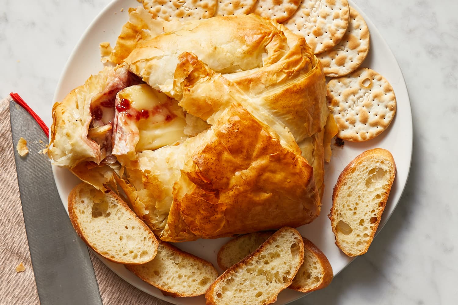 Place a wheel of Brie in the center of the phyllo. Top with raspberry preserves, then fold the corners of the phyllo dough over the top of the Brie and preserves. Brush the whole thing with more butter, then transfer to the parchment-lined baking sheet. Bake until golden, then serve warm with bread or crackers.